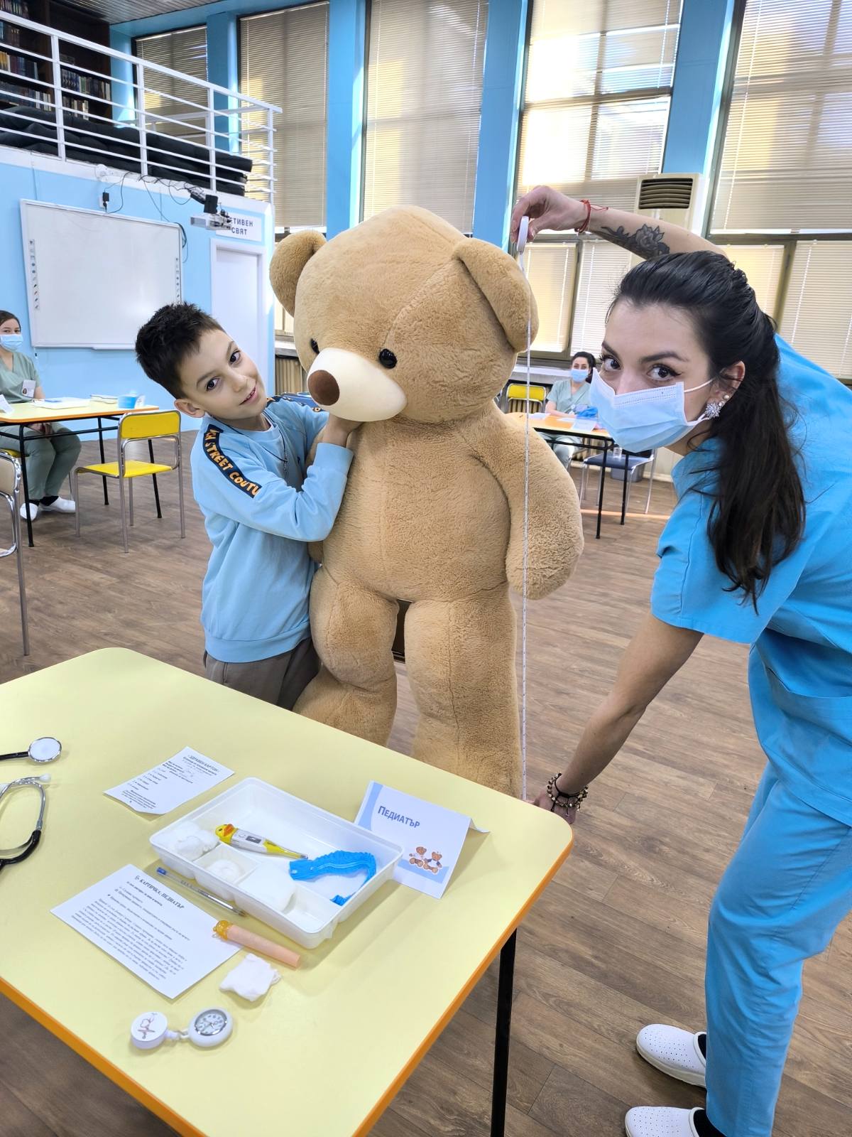 С много внимание и топлота бъдещите медицински сестри стопиха дистанцията между децата и медицинската професия по един естествен, достъпен и истински детски начин. Заедно те поставяха „диагнози“ на ранените плюшени пациенти, превързваха ги и им предписваха грижи, превръщайки играта в ценен урок по съпричастност и смелост.